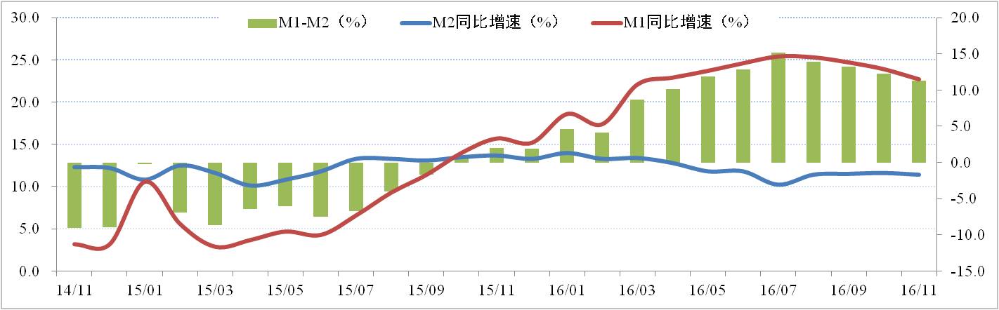 據央行數據統計顯示,中國11月M2貨幣供應同比增速為11.4%,環比回落0.2個百分點;M1貨幣供應同比增速為22.7%,環比回落1.2個百分點。 M1與M2剪刀差進一步縮小為11.3%。