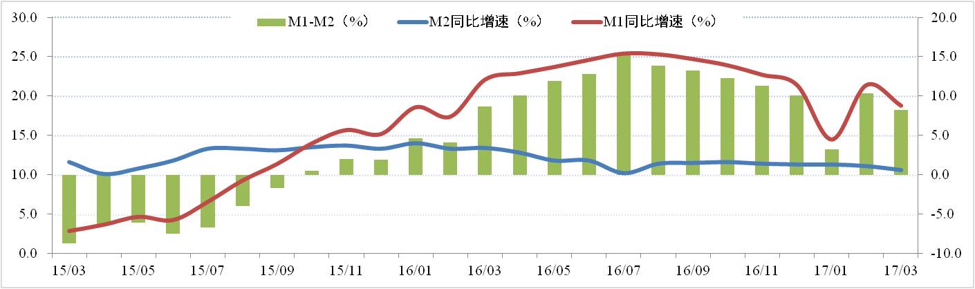 2017年2月廣義貨幣(M2)余額159.96萬億元,同比增長10.6%,增速分別比上月末和去年同期低0.5個(gè)和2.8個(gè)百分點(diǎn);狹義貨幣(M1)余額48.88萬億元,同比增長18.8%,增速分別比上月末和去年同期高2.6個(gè)和3.3個(gè)百分點(diǎn)。