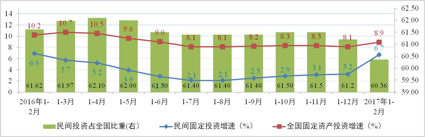據(jù)國家統(tǒng)計(jì)局統(tǒng)計(jì)數(shù)據(jù)顯示,2017年1-2月全國固定資產(chǎn)投資完成額度為4.14萬億元,同比增長8.9%,增速比去年全年提高0.8個(gè)百分點(diǎn)。其中,民間固定資產(chǎn)投資額為2.98萬億元,同比增速為6.7%,增速創(chuàng)11個(gè)月新高;較去年全年提高3.5個(gè)百分點(diǎn),連續(xù)第7個(gè)月增速環(huán)比提升。