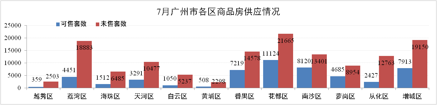 7月31日,廣州市新建住宅商品房共189,053套。其中:可售住宅商品房為52,695套,占比27.85%;未售住宅商品房136,394套,占比72.15%。花都、增城、番禺、荔灣庫存量較高,可售和未售房源累計(jì)占全市比例分別為58.31%和54.46% 。