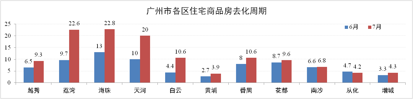 截至7月底,由于近期成交量回落,廣州住宅地產(chǎn)去化周期上升至7.2個(gè)月,總體庫存量為643.54萬㎡。其中,海珠、荔灣、天河三區(qū)去化周期明顯上升,荔灣區(qū)為22.8個(gè)月,居于全市首位。而黃埔、增城等區(qū)因價(jià)格相對(duì)較低,剛需較強(qiáng),去化周期僅剩4個(gè)月左右。