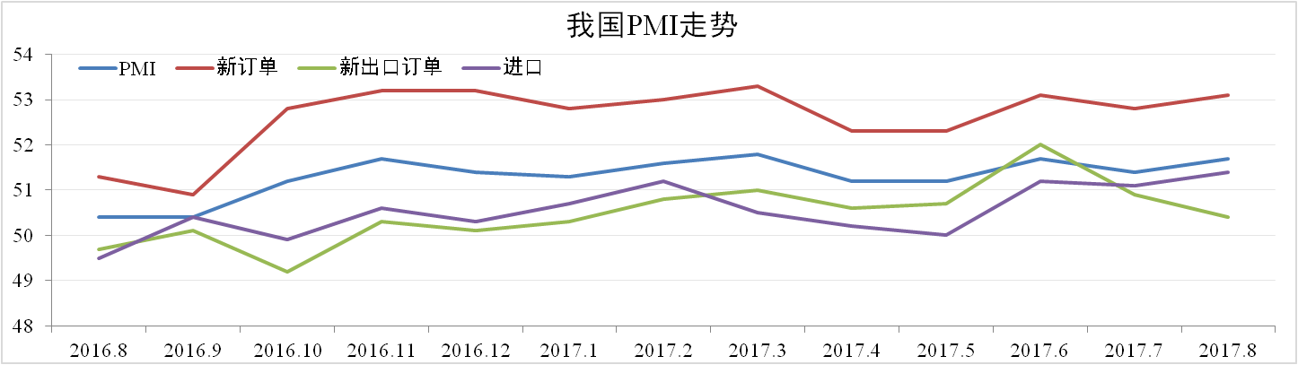 8月份我國制造業(yè)PMI為51.7,較上月上漲0.3,處于擴張區(qū)間。分項中,生產(chǎn)自53.5上升至54.1,新出口訂單自50.9下降至50.4,進(jìn)口訂單自51.1上升至51.4,主要原材料購進(jìn)價格自57.9大漲7.4個百分點至65.3。