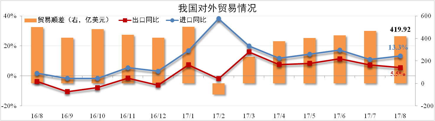 據(jù)海關(guān)總署數(shù)據(jù),8月份我國進(jìn)口量為1572.37億美元,同比上漲13.3%,較7月擴大2.3個百分點;出口量為1992.29億美元,同比上漲5.5%,較7月縮小1.7個百分點。貿(mào)易順差為419.92億美元,較上月下降10.15%。