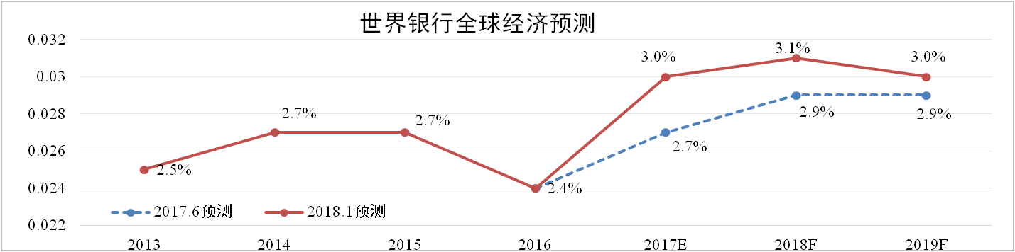 2018年1月9日世界銀行發布《2018年全球經濟展望》報告,預測隨著投資、制造業和貿易的持續復蘇,2018年全球經濟將加快至3.1%。但在勞動力和資本得到充分應用及各國央行逐步取消寬松貨幣的情況下,潛在增長將會放緩,2019年經濟增速將回落至3.0%。