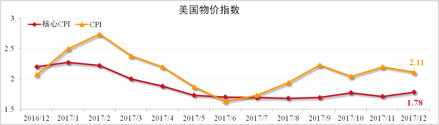12月美國CPI為2.11%,較上月下滑0.09個百分點。剔除能源和食品的核心CPI為1.78,較上月擴大0.07,超出市場預期。2017年全年美國零售銷售增長4.2%,為3年最大漲幅。