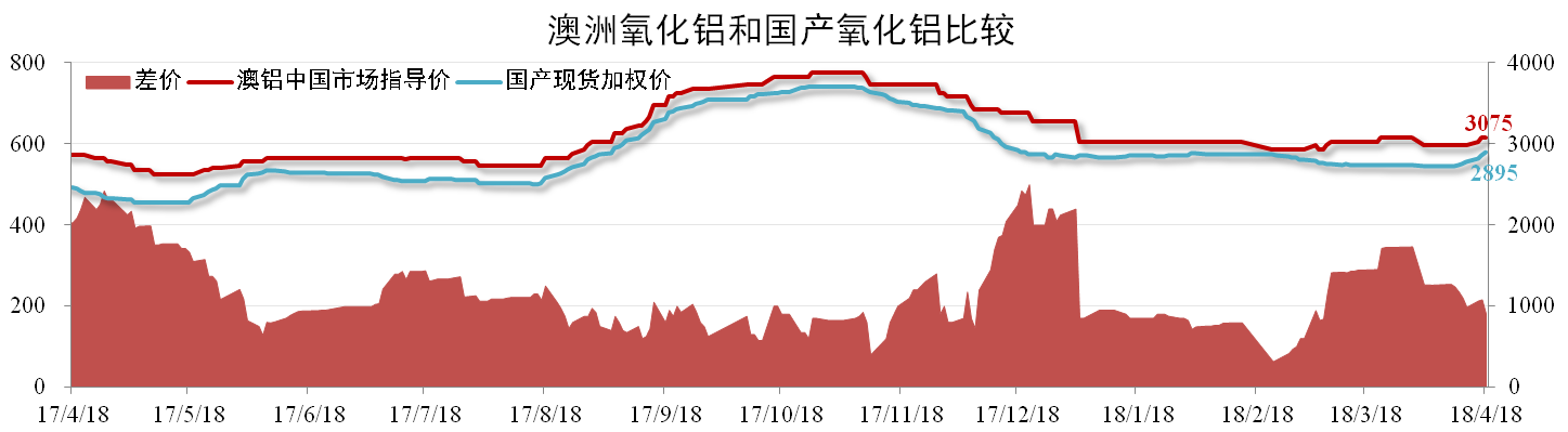 截至4月18日,國產(chǎn)氧化鋁現(xiàn)貨加權(quán)均價(jià)為2895元/噸,同比上升18.03%,環(huán)比上升5.82%。澳鋁中國市場指導(dǎo)價(jià)為3075元/噸,環(huán)比上升1.65%,二者價(jià)差180元/噸,較上月同期縮窄109元/噸。