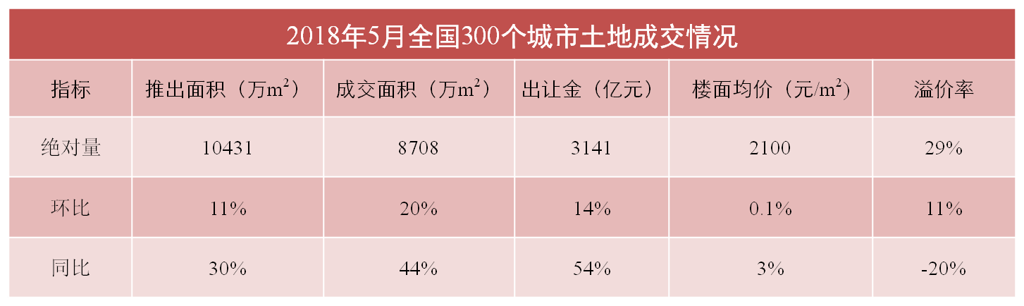 發(fā)稿時間:2018-06-225月全國300城市土地市場總成交面積為8,708萬㎡,環(huán)比增加20%,同比增加44%。其中,住宅用地成交面積3,110萬㎡ ,環(huán)比增加18%,同比增加74%。土地溢價率為29%,較上增長11個百分點,同比收縮20個百分點。