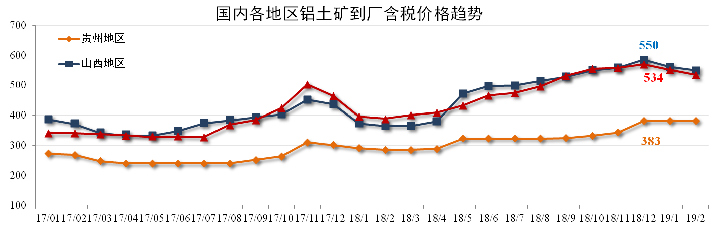 2月份,各地鋁土礦價格有不同程度的下滑,貴州(AL:60%,A/S:5.5-6)到廠含稅價月均價383元/噸,與1月價格持平;山西鋁土礦550元/噸,環比下降2.03%;河南鋁土礦534元/噸,環比下降3.09%。