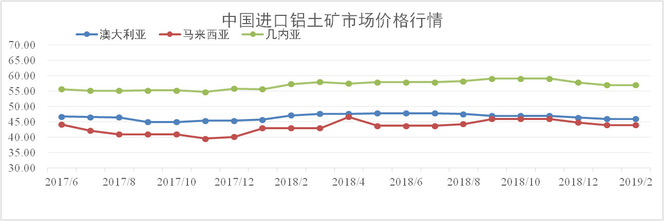 2月份澳大利亞進口鋁土礦到岸價格為46美元/噸,同比下降2.52%,馬來西亞為44美元/噸,同比上漲4.19%,幾內亞鋁土礦到岸價格為57美元/噸,同比下降0.57%。