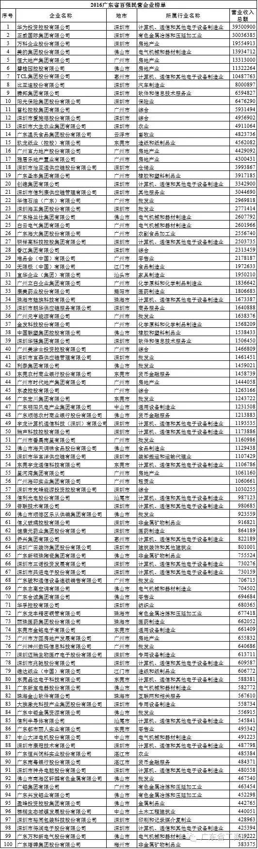 據介紹,省工商聯遵照全國工商聯關于開展“中國民營企業500強”排序工作的辦法和要求,今年首次開展“廣東省百強民營企業”排序工作。該榜單主要以2015年企業營業收入為基本標準,以企業會計年表為依據,排序經有關部門審核。